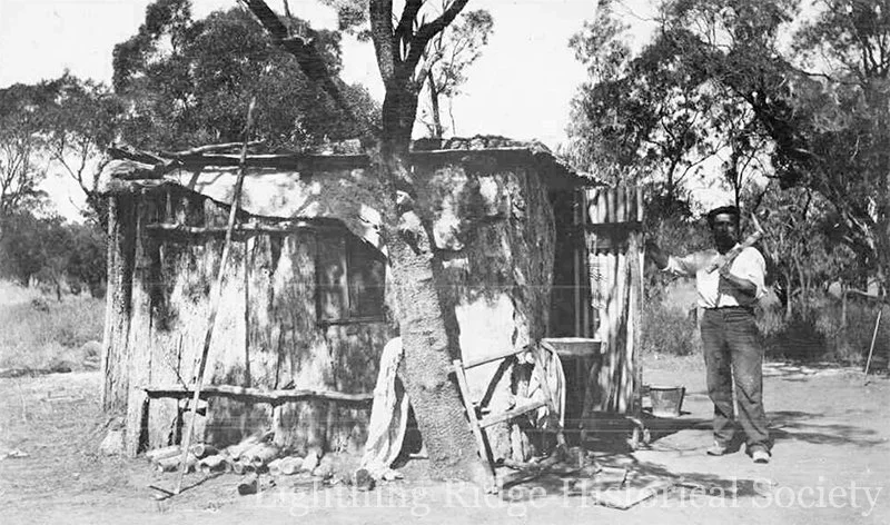 Charlie Gibson alongside a humpy on the opal fields, ca. 1915. (National Library of Australia.)