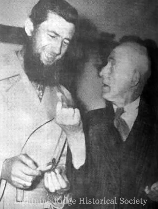 Article: Research by Leisa Carney, edited by Russell Gawthorpe. LRHS research compiled by Len Cram and Barbara Moritz. Sources: A Journey With Colour: A History of Lightning Ridge Opal 1873-2003, Len Cram, 2003, p. 174; ‘A Walkabout on the Opal’, ABC Weekly, vol. 10 no. 35, 28 August 1948, p. 16; ‘Chips Rafferty and Ion Idriess in The Story of Black Opal’, Centralian Advocate, 27 August 1948, p. 7; Blue Plaques program, Heritage NSW; ‘Chips Rafferty’, Australia Screen; T. Green, ‘The Legend of Chips Rafferty’, National Film & Sound Archive.