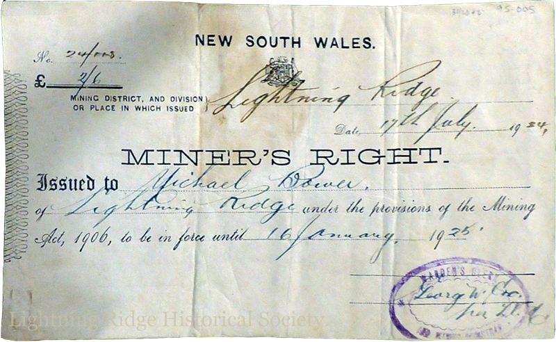 Article: Research by Leisa Carney, edited by Russell Gawthorpe. LRHS research compiled by Len Cram and Barbara Moritz. Sources: The Lightning Ridge Book, Stuart Lloyd, 1967, pp. 9, 18; Lightning Ridge - The Home of the Black Opal: Unique to the World, Gan Bruce, 1983, p. 56; The Lightning Flash Newspaper, 27 August 1971, 26 April 1972, 22 May 1975, 19 November 1987; The Walgett Spectator, 23 August 1928; A Journey With Colour: A History of Lightning Ridge Opal 1873-2003, Len Cram, 2003, p. 265.