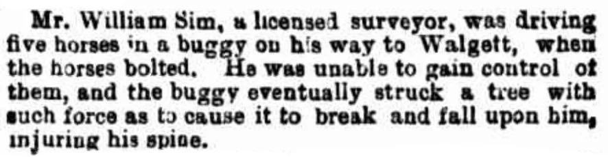 In February 1900 Sim fell victim to a serious accident near Lightning Ridge. While driving his horse and buggy, he was thrown beneath a tree and suffered severe internal injuries - either a spinal injury or an abdominal wound; possibly both. Despite receiving medical care (such as it was in 1901), his condition left him incapacitated, and he endured long-term pain for a year before his passing. On 21 March 1901 he died at Marrickville, aged 43, his death attributed to the lingering effects of the accident. He was buried in New South Wales.